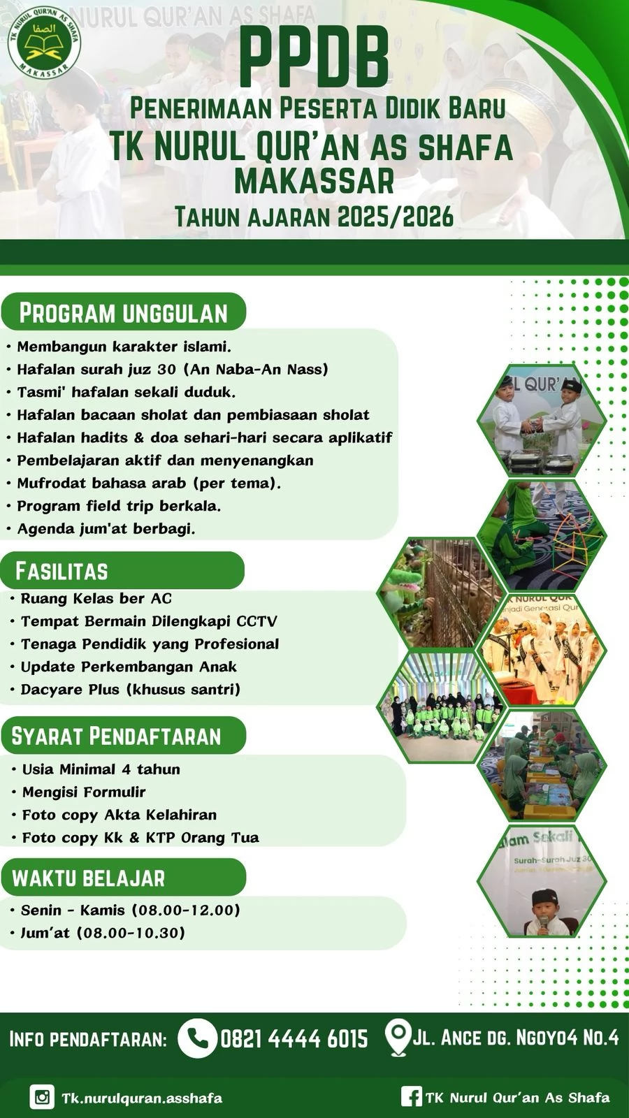 TK Nurul Qur’an As-Shafa Makassar membuka pendaftaran siswa baru untuk tahun ajaran 2025/2026!
